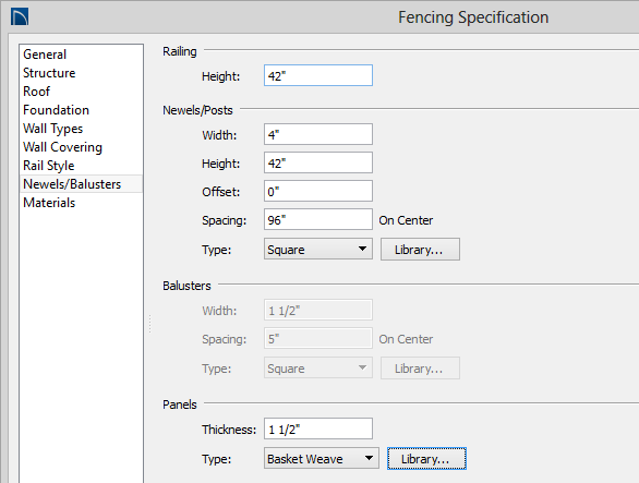 - In the Panels section, click on the Library button, and in the Select Library Object dialog that displays, browse for an appropriate fencing style, select it, then click OK to return to the Specification dialog.